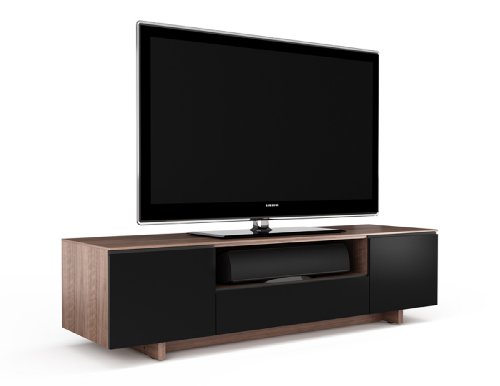 The modern design of the Nora cabinet creates a sleek home for a flat-panel TV and components. Nora features a component compartment at each end (left & right) behind soft-close doors; the center includes an open speaker compartment and a flip-down door that conceals two additional component compartments. Natural Walnut finish with micro-etched black glass doors. 20.25"H x 76.75"W x 22"D.