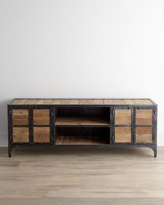 Eco-friendly entertainment chest offers great options for storage. Imported. Made of reclaimed fir and recycled steel. Four doors and two shelves. 67"W x 15.75"D x 24.5"T.