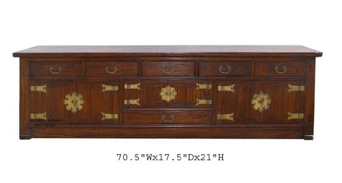 This beautiful Korean low table cabinet is hand made with solid Elm wood. Very well built with unique Korean design brass hardware. It have six drawers and three shelves door. Besides it can be a storage cabinet, and it also is very good entertainment cabinet. The TV can be put on the top of the cabinet, the shelf can be store your VCR/DVD player, and those drawer can be put your CD/DVD or remote controller. It's very functional piece for entertainment. Outside Dimensions: 70.5"Wx17.5"Dx21"H Larger Drawer Inner Dimensions: 19"Wx12"Dx2.5"H Small Drawer Inner Dimensions: 10"Wx12"Dx2.5"H Larger Shelf Inner Dimensions: 18"Wx14"Dx10"H Middle Shelf Inner Dimensions: 18"Wx14"Dx6.5 Material: Elm Wood