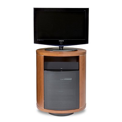 Flow-through ventilation keeps equipment cool. Removable back panel facilitates access to equipment. Enclosed cable management keeps wires neat. Safe, tempered glass. Adjustable shelves and corner-friendly design. Compact design makes this REVO Home Theater Cabinet ideal for a smaller home entertainment area. With space for up to five components and a medium-sized display, this contemporary television cabinet is a perfect fit for areas where space is limited. And, a rotating base allows for easy viewing from any part of the room.. . . . . Accommodates up to a 37" flat-panel TV.