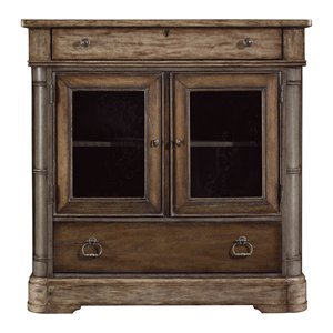 Finish:Temps Everything old is new again. Especially when you use our rustic Gathering Room Media Case as an unexpected base for your bedroom's flat panel TV. Built to house up to a 49' base atop the 48' high frame, the Gathering Room Media Case conceals a host of modern electronic needs in a vintage-styled case. The upper most compartment is hinged, and drops down to display a self-contained surge suppressor. Below, two glass-fronted doors offer visual access to DVD, BluRay, cable, stereo, satellite and network boxes, no matter whether the doors are open or closed. A single adjustable shelf increases flexibility. Along the bottom, a ring-and-rosette studded deep drawer holds sweaters, blankets or spare linens. Flanked on either side by banded, distressed balustrades, the overall look feels as distinctive and one-of-a-kind as a vintage salonnette from a French antiques fair.One adjustable shelf behind doorsTop drawer folds downSurge suppressor